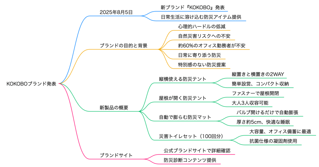 株式会社キングジムは、2025年8月5日に新防災ブランド『KOKOBO(ココボ)』を発表しました。このブランドは、日常生活に溶け込む防災用品を提供することを目的としており、特別感のない防災を提案します。新製品には、縦横使える防災テントや自動で膨らむ防災マット、災害トイレセットなどが含まれ、これらは日常的に使用できるサイズとデザインが特徴です。防災に対する心理的ハードルを下げ、より多くの人々が備えを持つことを促進する狙いがあります。