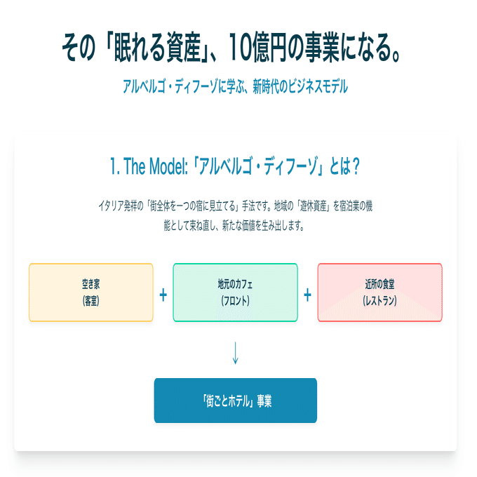 巨額の設備投資でホテルを新設するのではありません。 すでにある「遊休資産(空き家、既存店、地元の人)」を、一つのルールで束ね直しているだけ。初期投資が極めて低く、リスクが小さい。まさに「賢い」ビジネスです。