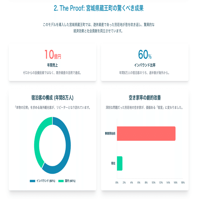 今の観光客、特に富裕層やリピーターは、ピカピカの観光地より「リアルな日本の日常」を求めています。このモデルは「ホテルに泊まる」のではなく、「街に溶け込む」という圧倒的な体験価値を提供します。泊まる宿が毎回違うため、30回以上通うリピーターまで生まれるのです。