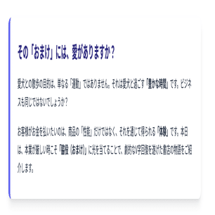 中小企業の強みは、こうした「遊び心」を社長の鶴の一声ですぐに実行できることです。 会議室で唸る前に、現場の「おまけ」を見直してみてください。そこに、次の柱となるダイヤの原石が転がっているかもしれません。