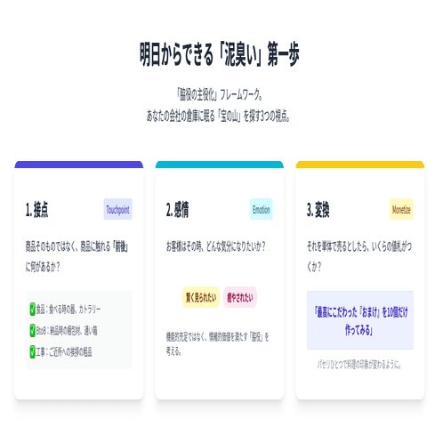 まずは、「最高にこだわった『おまけ』を10個だけ作ってみる」ことから始めてみましょう。 私の妻が料理をする時、最後に散らすパセリ一つで皿の印象が変わるように、小さな「脇役」がメインディッシュ(本業)の価値を劇的に高めることがあります。