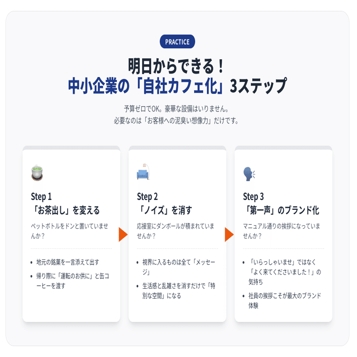 商談に来たお客様に、スーパーで買ったペットボトルのお茶をそのまま出していませんか?バーニーズがワイングラスでコーヒーを出すように、あなたの会社も「出し方」を変えてみてください。地元の銘菓を添えて「これ、私が大好きなお菓子なんです」と一言添える。社用車でお越しの方には、帰りに「運転のお供にどうぞ」と温かい缶コーヒーを渡す。これだけで、あなたの会社は「ただの取引先」から「気遣いのできるパートナー」という体験に変わります。