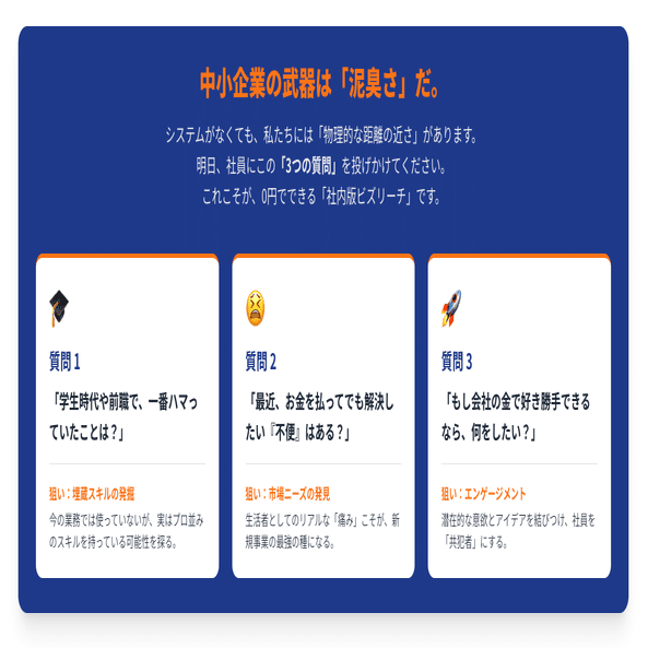 システムがなくても、私たちには「物理的な距離の近さ」があります。 社員の隠れたスキルや、過去の経験、実は持っている「やりたいこと」。これらを掘り起こすだけで、新規事業の種は驚くほど見つかります。
