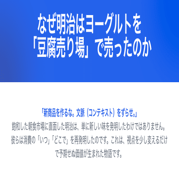 実はこれ、ビジネスでも全く同じことが言えるんです。 「モノ」は同じでも、「食べるシーン」や「置く場所」を変えるだけで、全く別の価値が生まれる。