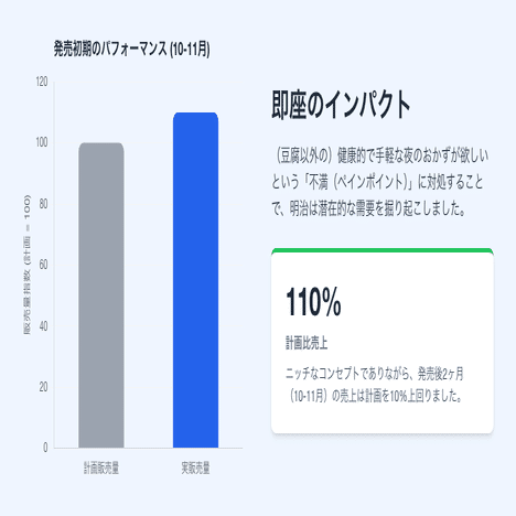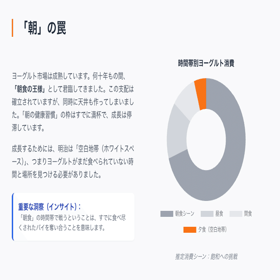 従来のヨーグルトは「朝食」の王様です。しかし、市場は成熟し、これ以上の大きな伸びは期待しにくい。そこで明治は、ターゲットを「夕食の副菜・おつまみ」にずらしました。 「夜も健康的なものを食べたいけれど、冷奴ばかりじゃ飽きる」という、今まで満たされていなかった「痛み(不満)」に目をつけたのです。