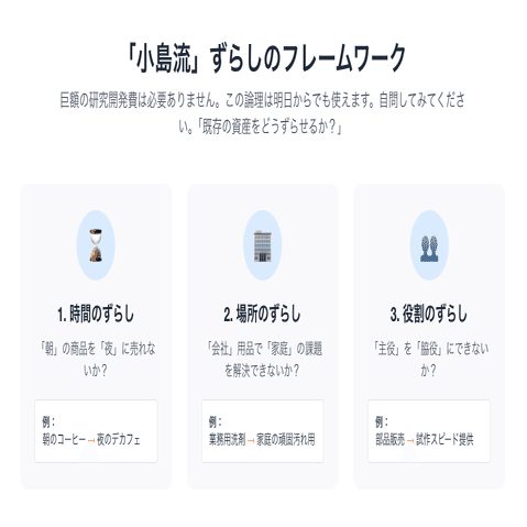 - 場所のずらし:会社用を家庭用にできないか?(例:業務用洗剤 → 家庭の頑固汚れ用)