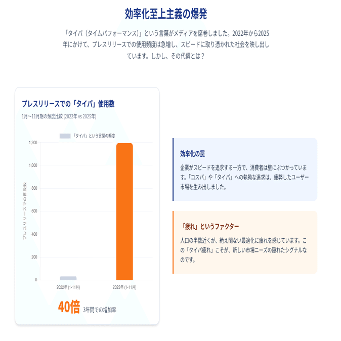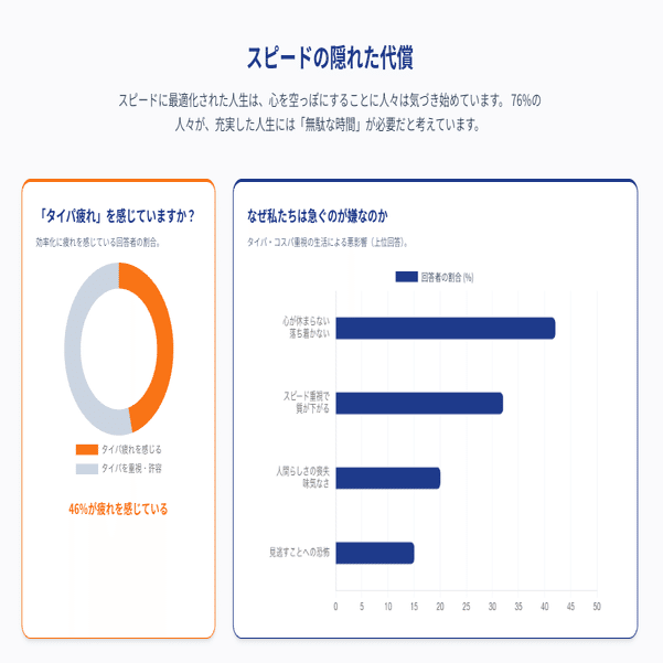 記事には衝撃的な数字が並んでいました。 タイパ・コスパを重視する人は依然として多いものの、その裏で「心が休まらない」「スピード重視で質が下がる」と感じている人が半数近くいます。