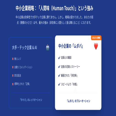 これをビジネスの現場に置き換えてみましょう。 大手企業やAIが得意なのは、徹底的な「効率化」です。レジの無人化、おすすめ商品の自動提案、配送のスピードアップ。 私たち中小企業が、同じ土俵で「もっと早く、もっと効率よく」を追求したらどうなるか?