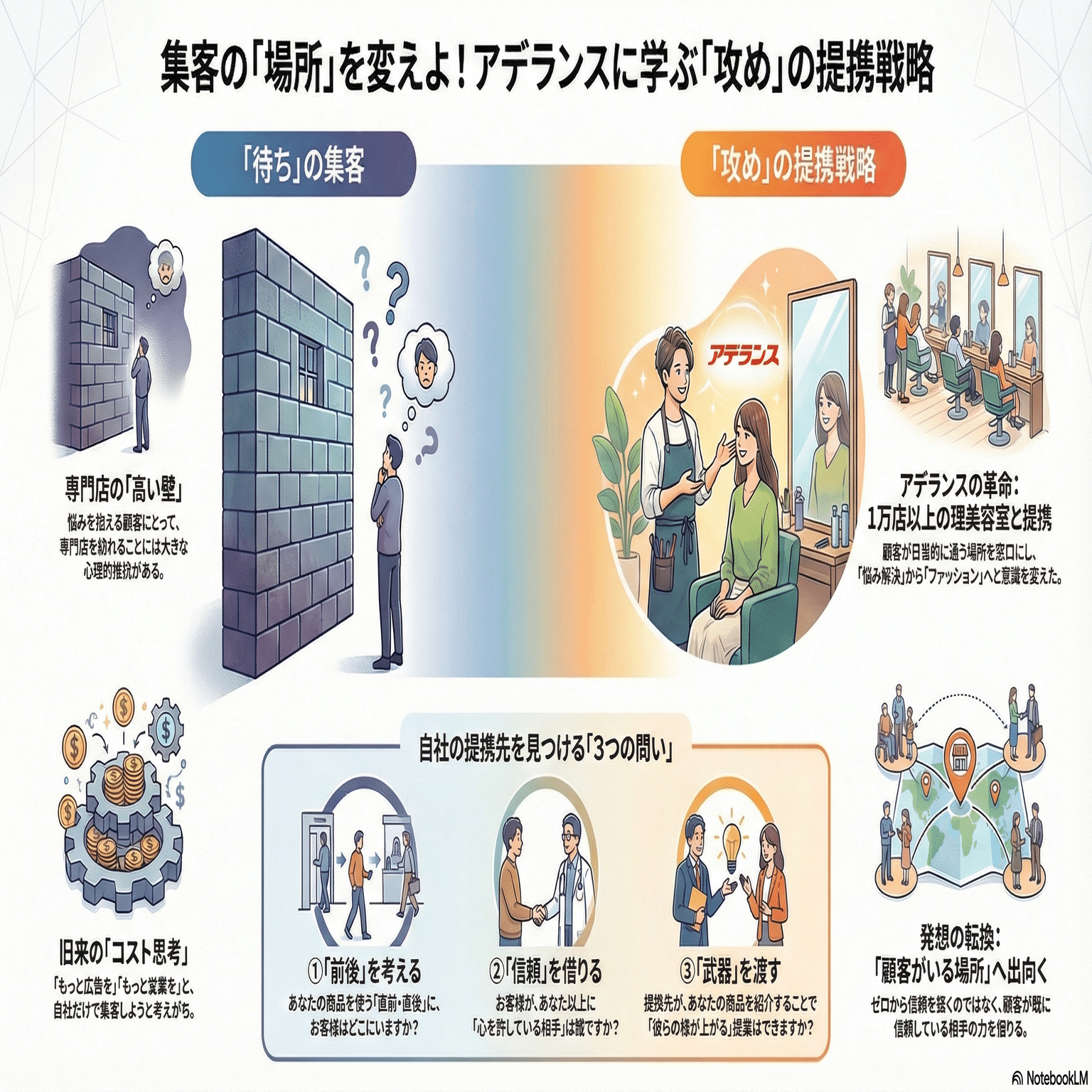 私たち中小企業には、アデランスのような知名度はありません。だからこそ、**「自社商品を、信頼関係ができあがっている他社に乗せてもらう」**という発想が、最強の武器になるのです。
