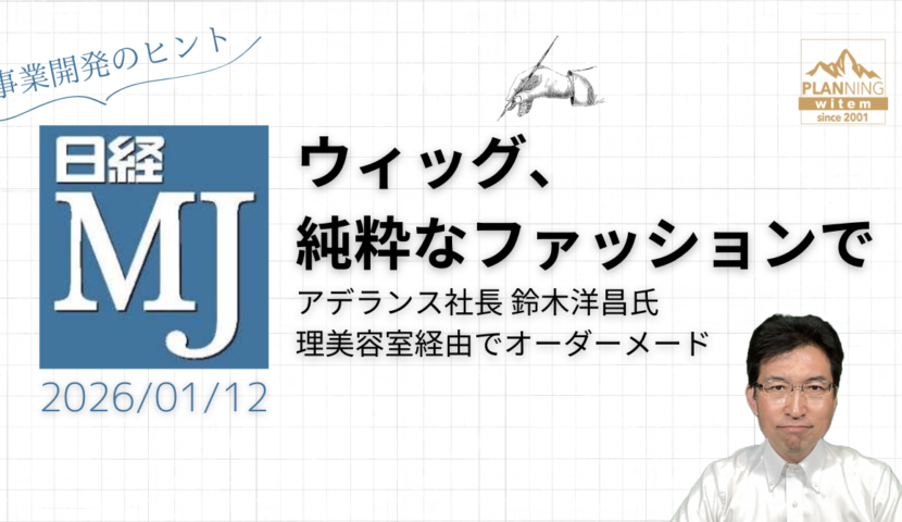 ウィッグ、純粋なファッションで アデランス社長 鈴木洋昌氏 (中略) 一般の理美容室でオーダーメードウィッグを購入できるサービスを始めました。 顧客は行きつけの理美容室に相談し、訪問に来たアデランスのスタッフにウィッグの試着や相談ができる。(中略) 理美容サロンは全国に38万店ほどあり、開始3カ月で既に1万2600店の理美容院と提携した。 (日経MJ 2026/1/12)