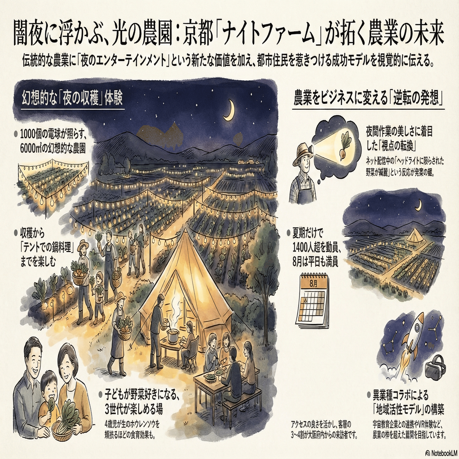 今回取り上げるのは、京都で農業関連事業を手掛ける法人が始めた「ナイトファーム(夜の農業体験)」のニュースです。 暗闇の畑を1000個の電球でライトアップし、冬の寒空の下、夜にネギや白菜を収穫する。そしてテントで鍋を食べる。これが「SNS映えする」と話題を呼び、若いカップルから家族連れまで大盛況だというのです。