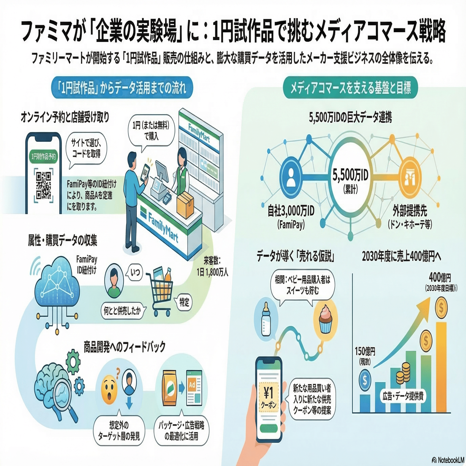 1日1800万人が訪れる店舗網と、累計5500万にも及ぶ会員IDのデータを掛け合わせる。たとえば「ベビー用品を買う人は、コンビニスイーツの購入率が20%高い」というデータから、「育児の疲れを癒やすリラックスグッズが売れるはずだ」という仮説を立てる。まさに大企業ならではの圧倒的なスケール感です。