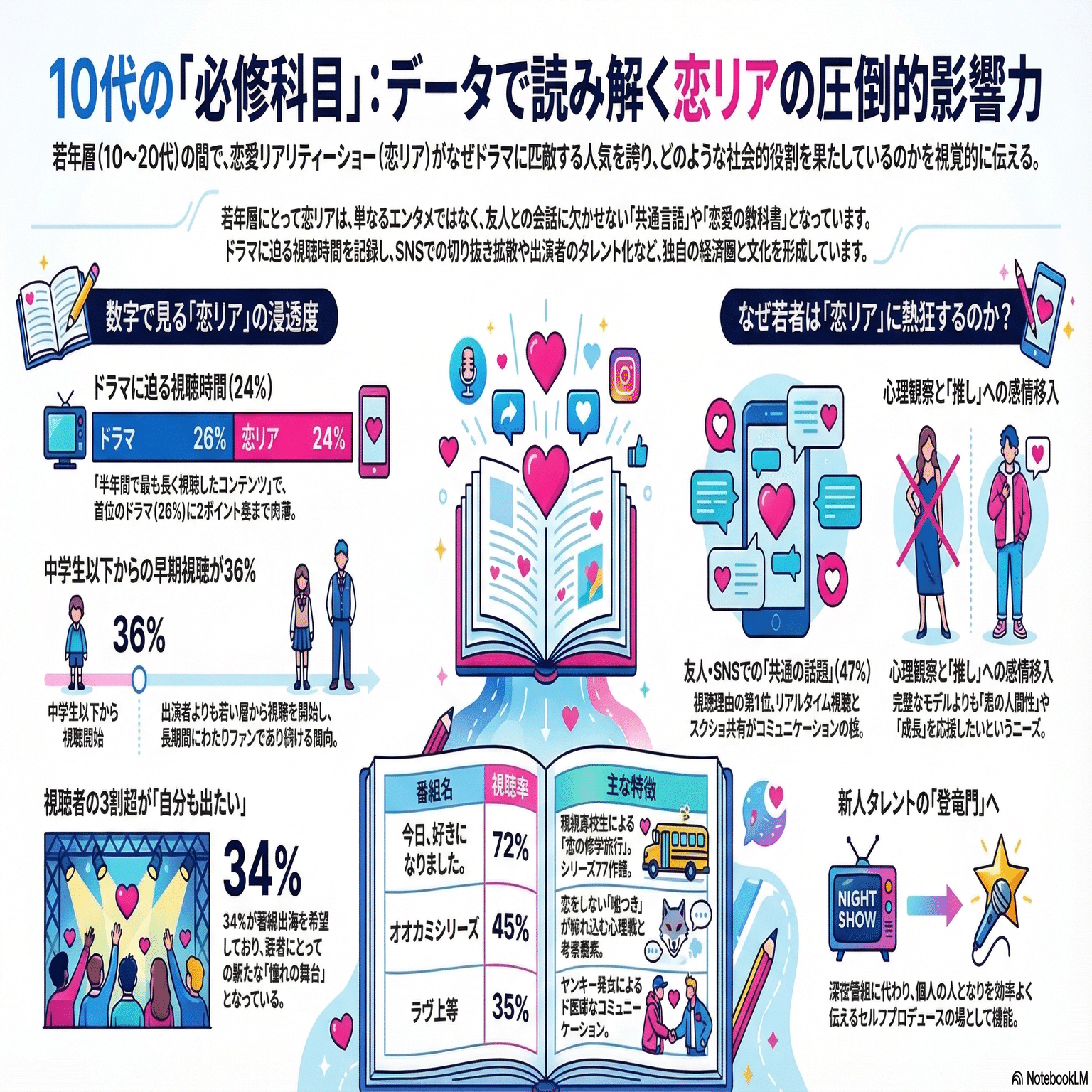先日、日経MJに興味深い記事が出ていました。 10代から20代にとって、恋愛リアリティショーはもはや「必修科目」なのだそうです。 アンケートでは、ドラマを抜いて視聴時間で首位に迫る勢い。しかも、彼らはただ見ているだけじゃない。出演者が着ている服を買い、コスメを買い、聖地へ足を運ぶ。