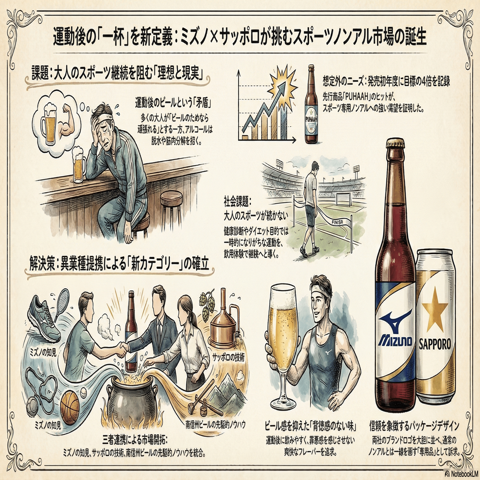 おはようございます。 皆さんは「大人のスポーツは長続きしない」というミズノの調査結果を知っていますか?健康のために走り始めても、結局挫折してしまう。ミズノはそこに着目し、「運動後のビールなら頑張れる」という大人の本音に応えるため、ノンアル飲料を開発しました。