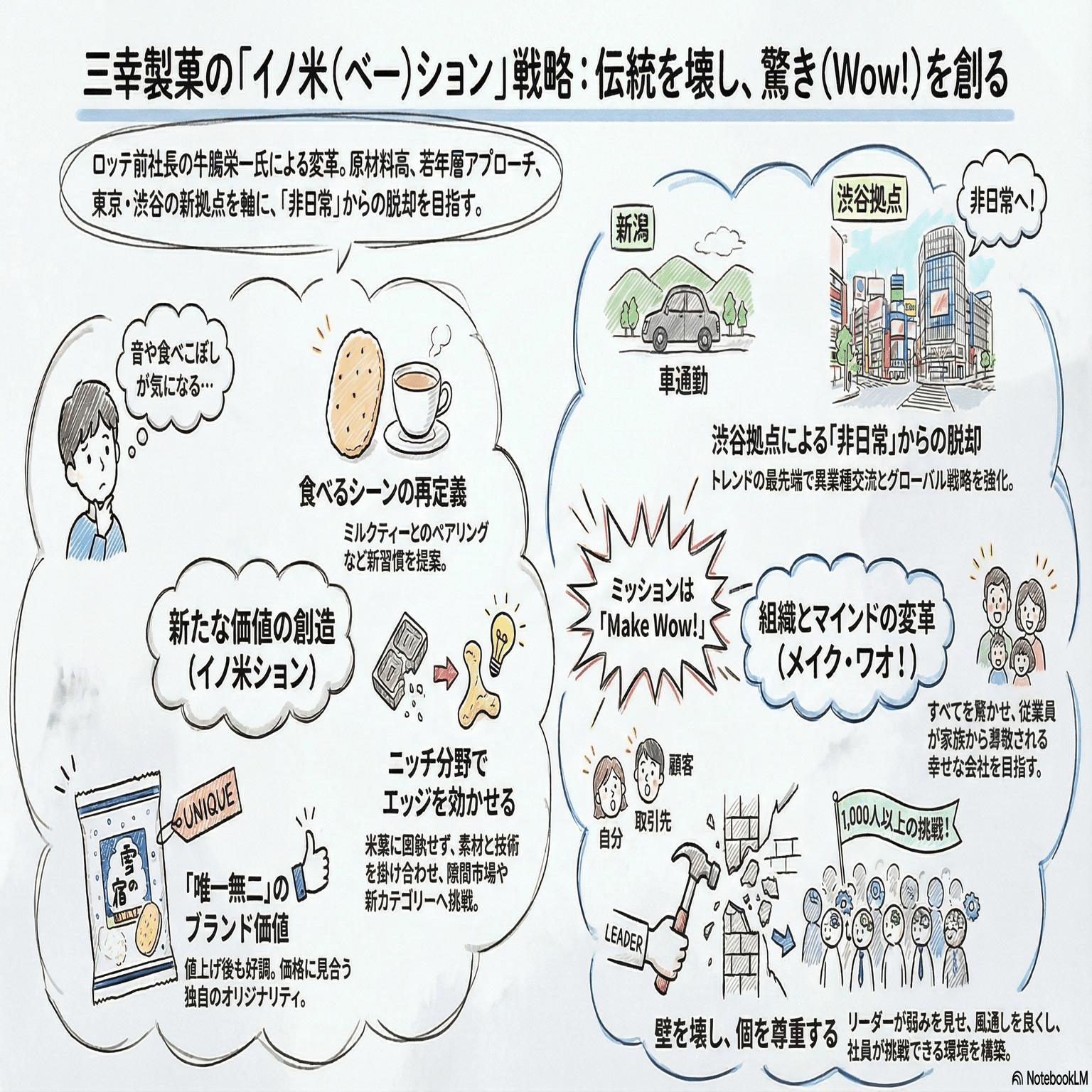 三幸製菓といえば「雪の宿」で有名な米菓大手ですが、今、ロッテ前社長の牛膓氏を迎え、猛烈な変革を進めています。彼が掲げるのは、名付けて「イノ米(ベー)ション」。